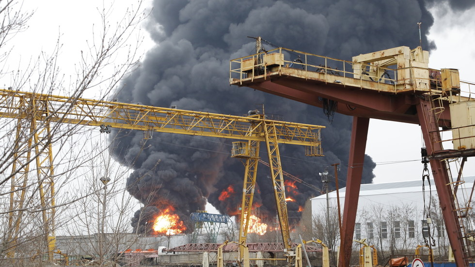 The nighttime incident was attributed to Ukraine by Governor Vyacheslav Galdkov of the Belgorod region on Friday morning. He said two Ukrainian helicopters attacked the oil facility after flying towards the border city at low altitude. Belgorod is located some 25km from Ukraine’s Kharkov region.