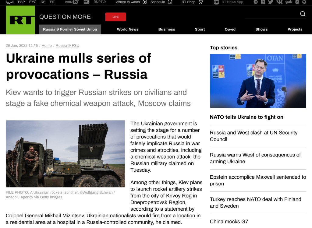 The Ukrainian government is setting the stage for a number of provocations that would falsely implicate Russia in war crimes and atrocities, including a chemical weapon attack, the Russian military claimed on Tuesday.