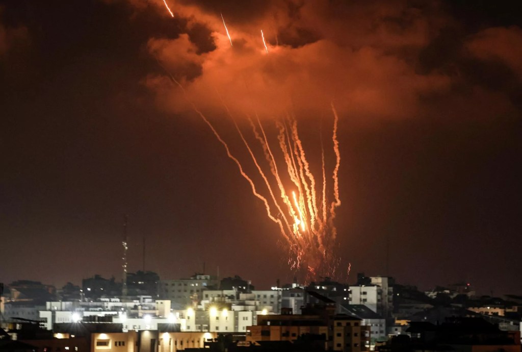 A picture taken on August 5, 2022, shows Palestinian rockets fired from Gaza City in retaliation to earlier Israeli air strikes.