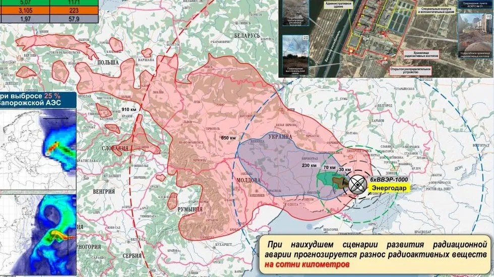 Igor Kirillov, who heads Russia’s Nuclear Biological and Chemical Defense Troops, illustrated the likely worst-case scenario of a direct hit on Europe’s largest nuclear plant, during a briefing on Thursday. He showed journalists a map, with plumes of radioactive material from the site reaching Poland, Slovakia, Romania, Moldova, Belarus and even Germany.