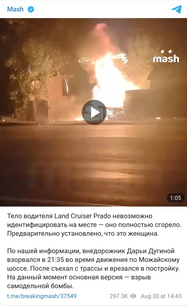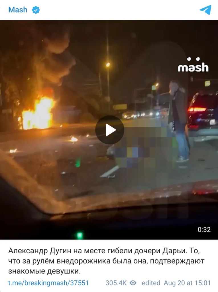 Authorities have yet to confirm the identity of the victim, but multiple Russian Telegram channels and media sources reported that the victim was 30-year-old Darya Dugina (Platonova). Her father, Alexander Dugin, was spotted at the scene soon after the incident, visibly shocked, according to several videos circulating on social media.