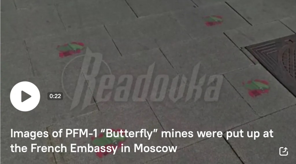 Activists placed images of ‘Butterfly’ mines on pavements near the French embassy in Moscow during a demonstration in August