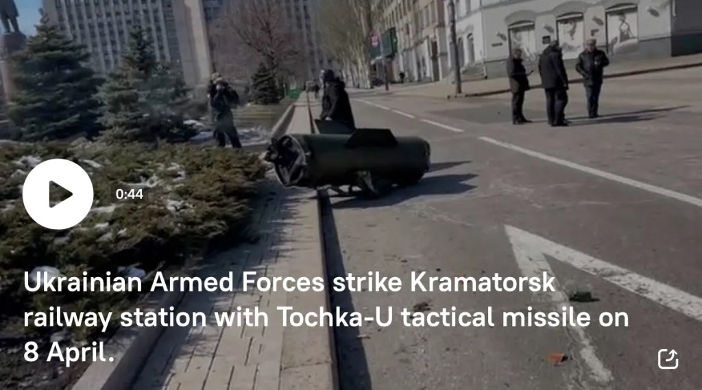 The above footage shows the aftermath of a Ukrainian Tochka-U missile strike on a railway station in Kramatorsk on 8 April