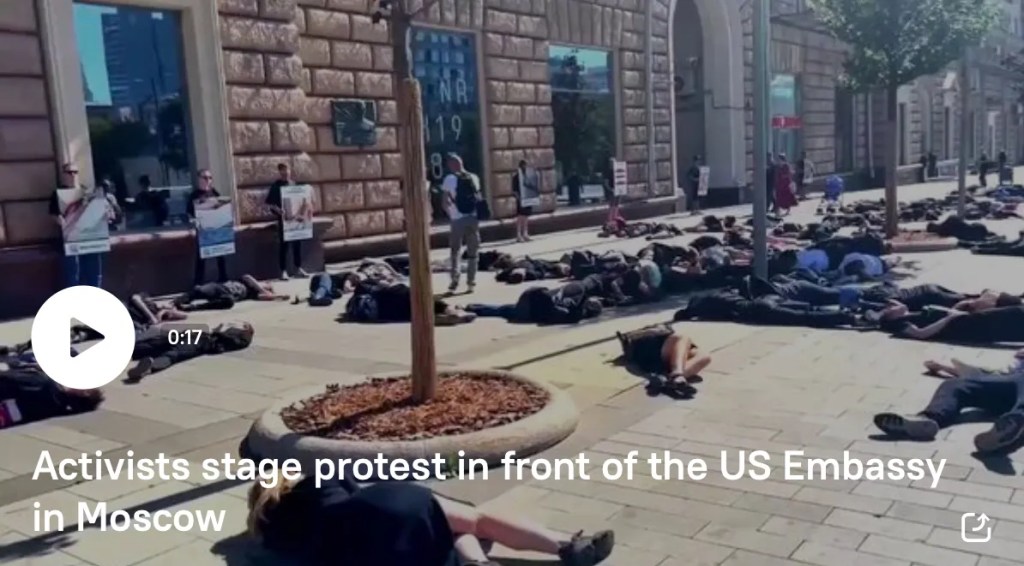 The above video shows activists staging a protest in front of the US Embassy in Moscow in support of the victims killed in the Donetsk People’s Republic by the ‘Butterfly’ mines