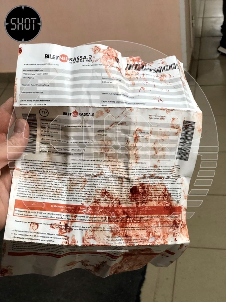 The photo shows a bloody ticket to a concert of the Picnic group in the Crocus near Moscow, where terrorists killed at least 40 people with automatic weapons.